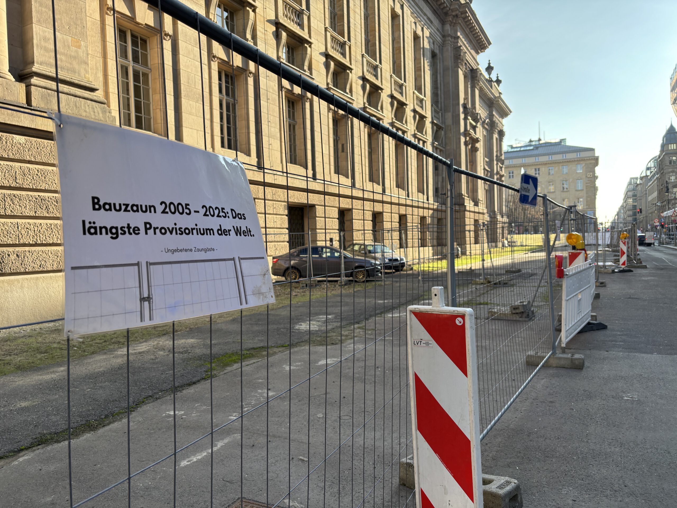 Mutter aller Baustellen. Seit zwanzig Jahren steht an der Staatsbibliothek Berlin ein Bauzaun. 2021 wurde das Gebäude saniert übergeben. Die Absperrung ist geblieben und bewacht das Nichts. Natürlich fühlt sich in Berlin niemand zuständig.